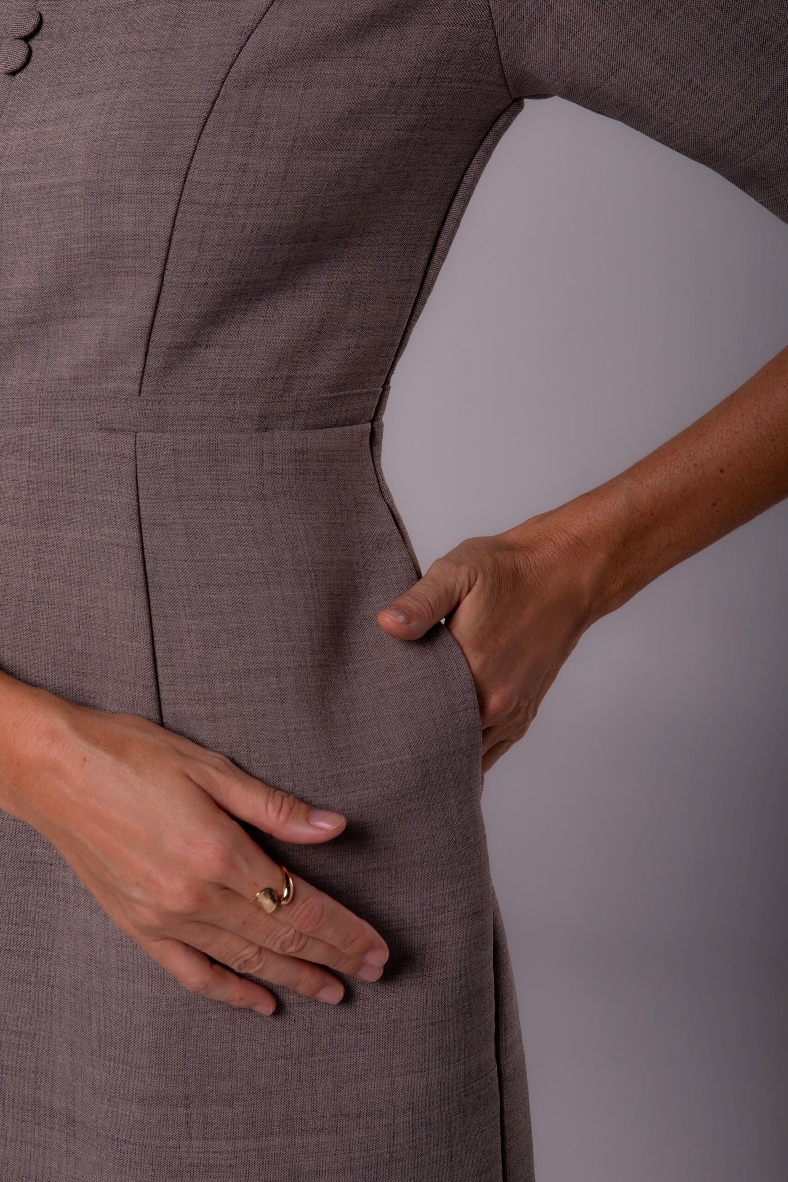 Classic Grey Fitted Midi Dress with Mandarin Collar – MT Clothes
